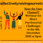 Please note the date change for the webinar for Men’s Psychosocial challenges is on the 8th December 2021 on zoom using the same details as before.